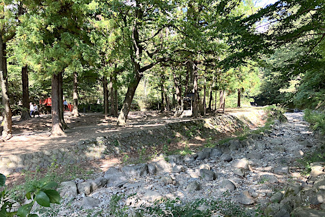 すぐ目の前、砥川(とがわ)の向こうに「浮島」が見えます。この島は、川の水がどんなに増えても決して流されないといわれています。その不思議さから、諏訪大社 下社の七不思議の一つに数えられています。