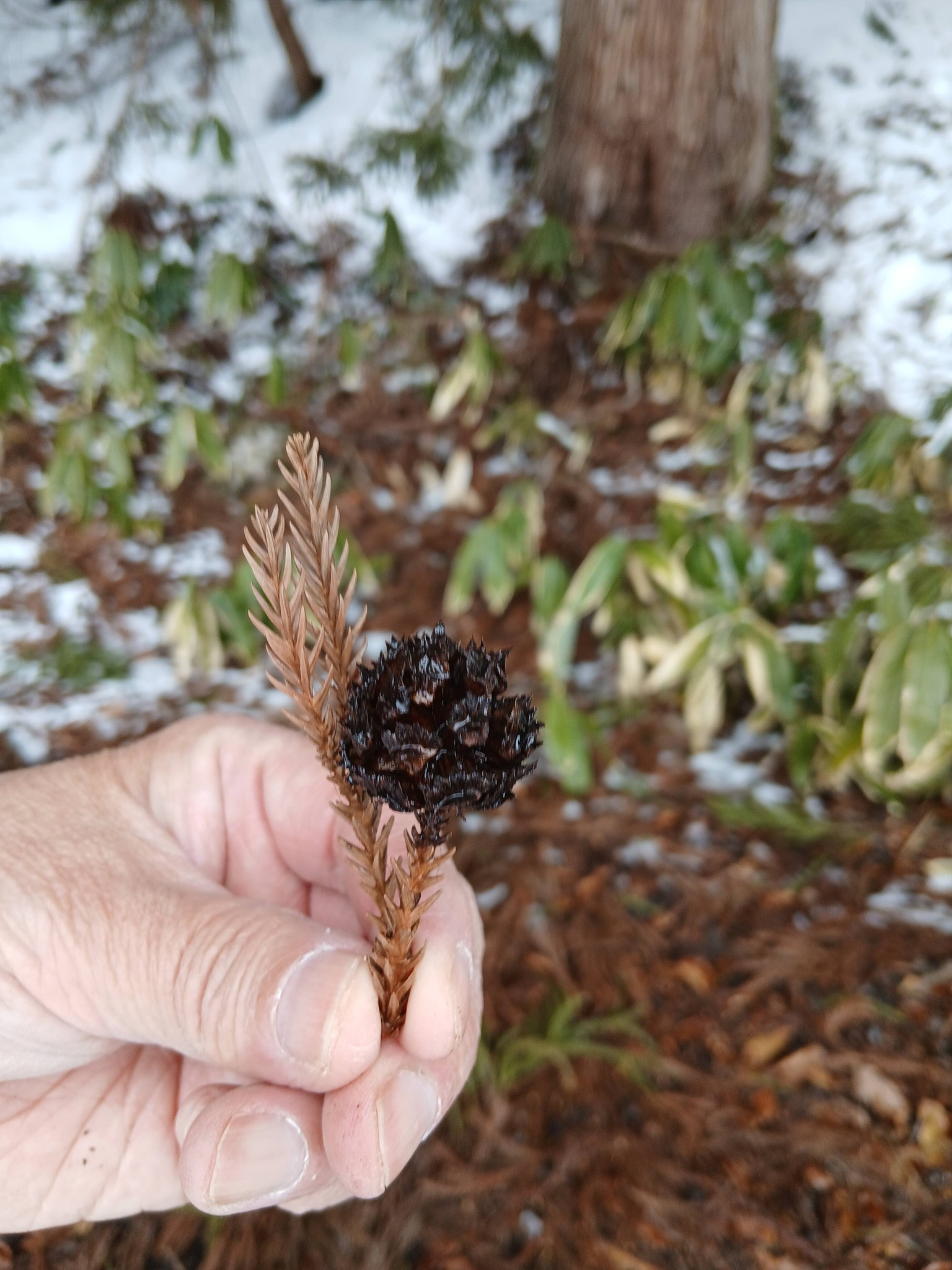 落ちてる杉の葉っぱの黒いボンボンの中から雪黒ノミが出て来ます。
