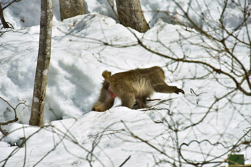 どんなに厳しい雪の中でも、お互いを尊重し合いながら春の訪れを待ちます。猿は冬眠しないので雪の上に出ている雑木の新芽を食べながら命を繋ぎます。