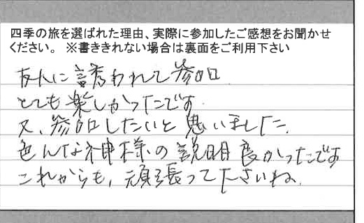 友人に誘われて参加。とても楽しかったです。また、参加したいと思いました。色んな神様の説明良かったです。これからも、頑張って下さいね。
