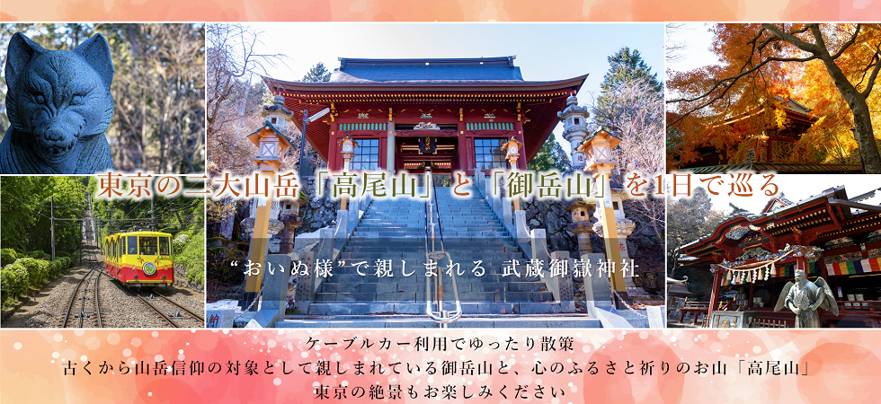 御岳、御嶽とは修験道の中心地である奈良県吉野の金峯山を指しており、蔵王権現、櫛真智命などを祀り、中世以降、山岳信仰の霊場として発展し、武蔵・相模に渡る信仰圏を獲得しました。 ご眷属の大口真神(おいぬ様)も祀っていることから、祈願のため犬を連れた参拝客が近年増えており、御岳山を登る御岳登山鉄道は、ケージを用いずに犬を乗車させることができます。