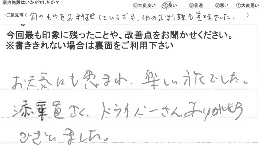 旬のものをお料理していただき、他のお料理も美味でした。 お天気にも恵まれ、楽しい旅でした。添乗員さん、ドライバーさん、ありがとうございました。