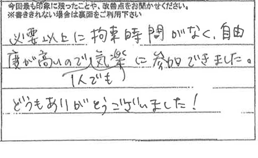 必要以上に拘束時間がなく、自由度が高いので1人でも気楽に参加できました。 どうもありがとうございました!