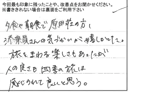 夕食や朝食で原田荘の方、添乗員さんの気遣いが嬉しかった。 旅をまわる楽しさもあったが人の良さも四季の旅は感じられて良いと思う。